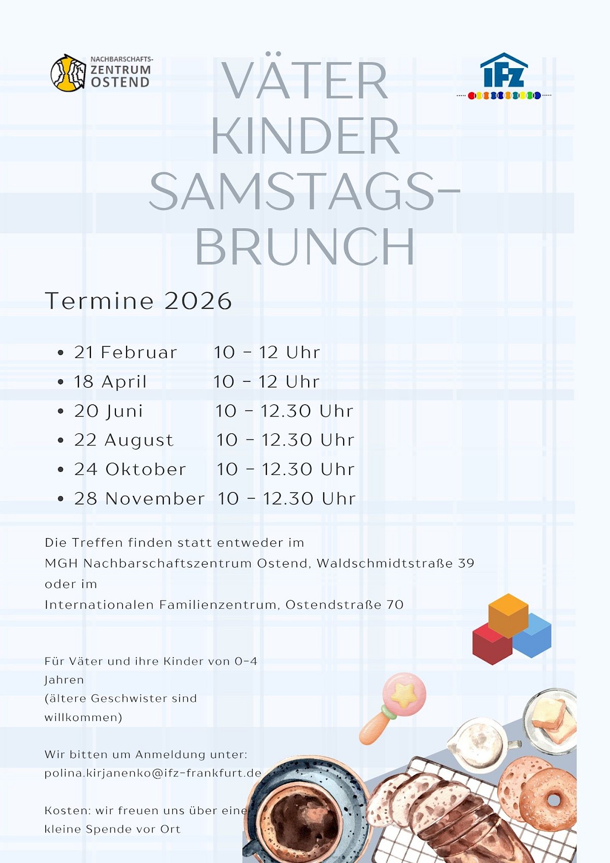 Offener Treff für Mütter und Väter mit Kindern im Alter von null bis sechs Jahren. In entspannter Atmosphäre können sich Eltern kennenlernen, austauschen, informieren und Kontakte knüpfen. Es finden auch Workshops und offene Runden zu wechselnden Themen sowie Ausflüge statt. Das Angebot ist kostenlos. Es gibt eine Kinderbetreuung.